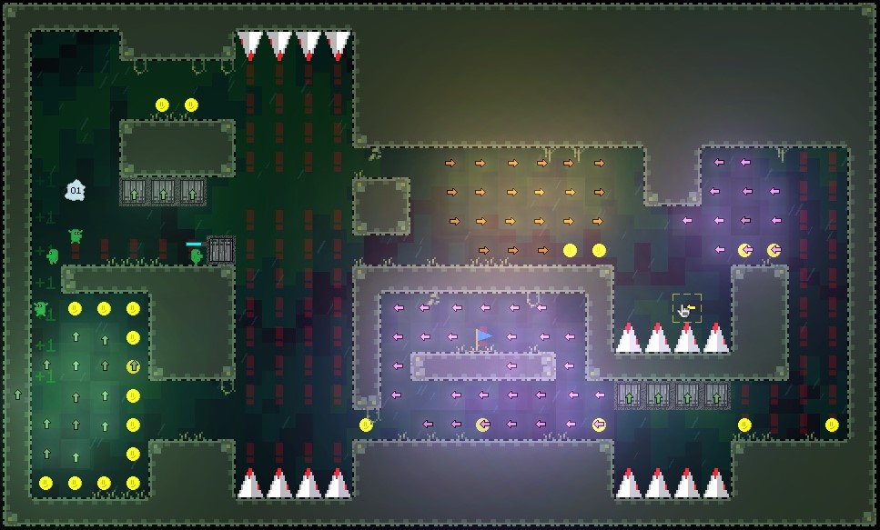 I have no idea what the “PUSH” block is. I was playing a lot of “Baba Is You” at the time so maybe I was blatantly trying to copy ideas from that game, not sure! I was playing around with many, many concepts at the time. I had a rough idea in my mind that the minions (the green dudes) would move around independently of the player, like in Lemmings and you would have to change gravity to manipulate them, but I had no idea how to execute on that concept. It required weeks and weeks of experimentation and trial and error. The green characters were called minions all the way through development. I didn’t decide to call them Kells until the very end so all the code refers to them as minions as well: